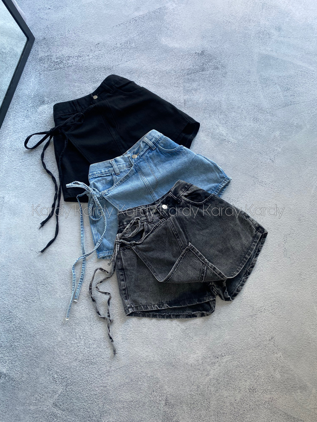 • Skort (falda adelante, short atrás) de tela jean rígida.